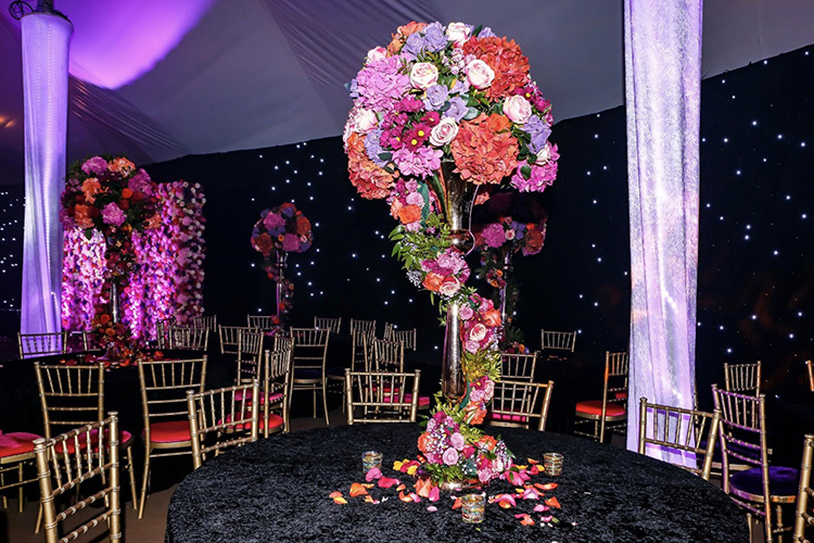 Held in our Mega Marquee, Natasha and Harry hosted a lavish Bollywood Themed Engagement Party. The Mega Marquee was completely transformed and gave guests the feeling they were stepping into a nightclub. The entire venue was draped with starlit cloth and featured a large round gold bar which showcased a huge orchid style tree in the centre of the venue.